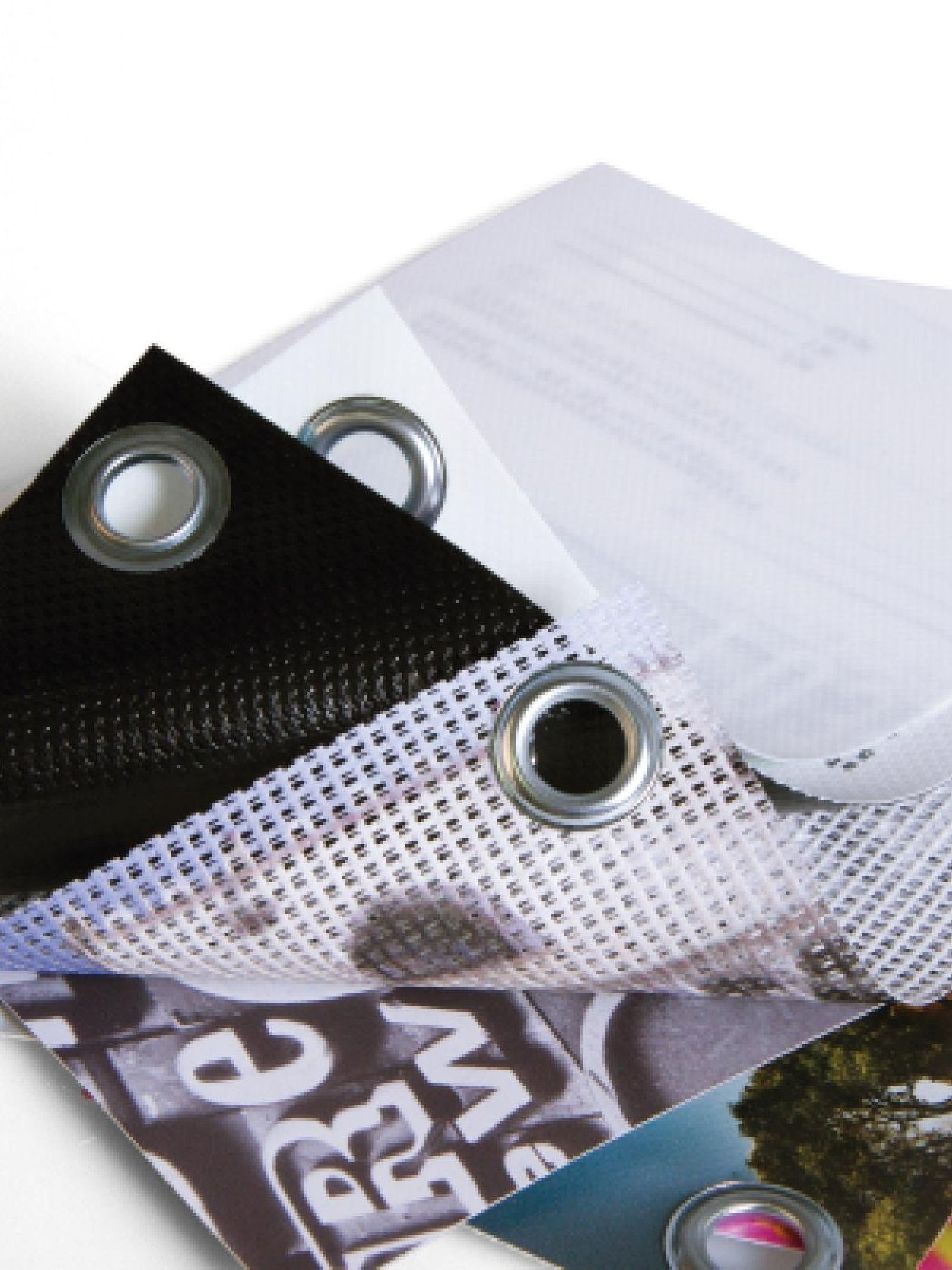 - Banner striscioni : Il telo vinilico utilizzato è resistente e ignifugo, adatto sia per applicazioni all'interno che all'esterno quali fiere, eventi sportivi, pubblicità semipermanenti. Termosaldabile ad alta frequenza per rinforzare la zona di applicazione degli occhielli, solitamente sul perimetro.